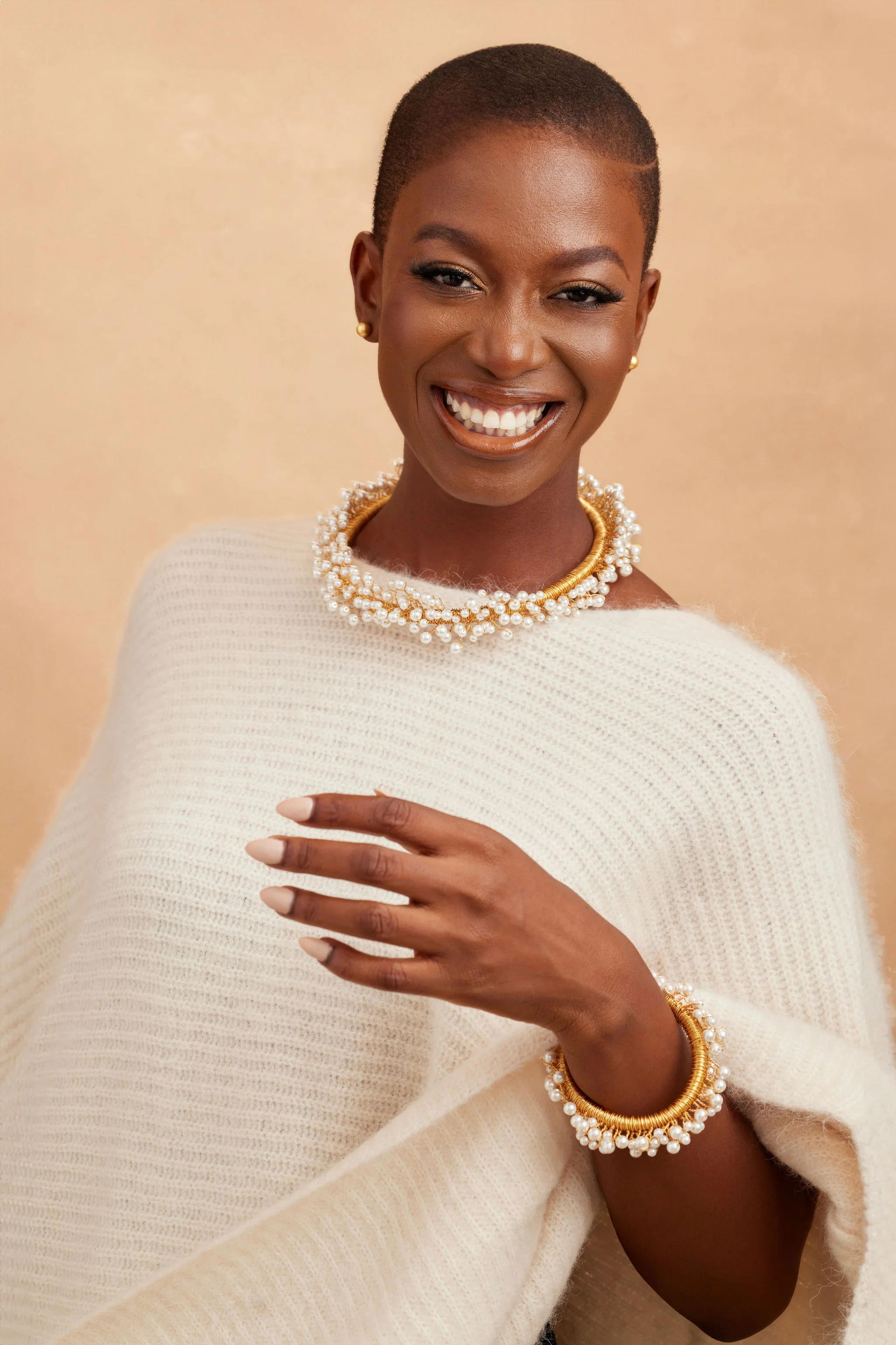 The ASAF (ah-saff) bracelet features a weave of hand-beaded pearls intricately intertwined around a brass base. This adjustable style can be twisted to create unique shapes.