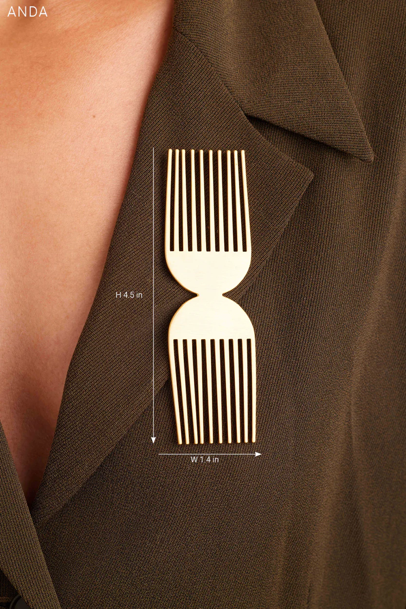 Our ANDA (ahn-dah) brooch is making a remarkable return. Celebrate the beauty, resilience, and artistry of Black culture with this stunning piece reminiscent of a hair pick comb— a miniature homage to one of the most iconic tools in Black hair history. The ANDA brooch features a double sided comb design with a horizontal pin. She is perfect for blazers, shirts and jackets.Â