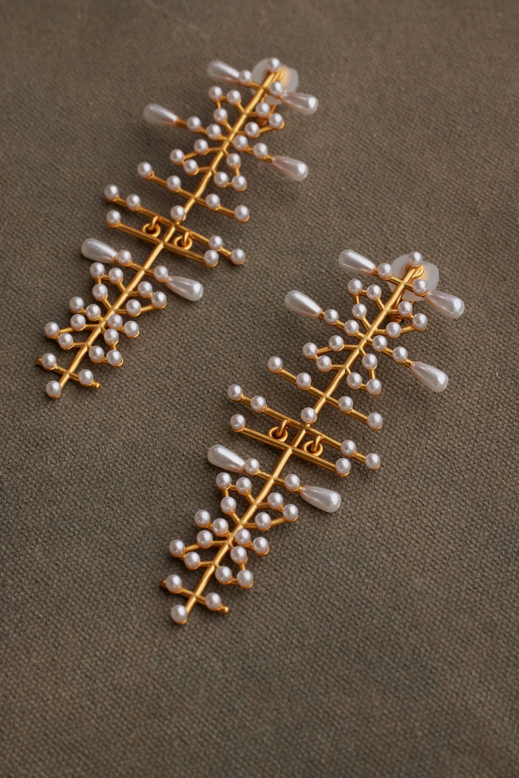 At the heart of her design lies lustrous, hand-selected pearls—radiating with natural sheen and elegance. Their organic roundness contrasts beautifully with the sharp angles, smooth edges, and architectural precision of the geometric frame. The interplay between pearl and metal creates a visually dynamic composition that draws the eye.Â