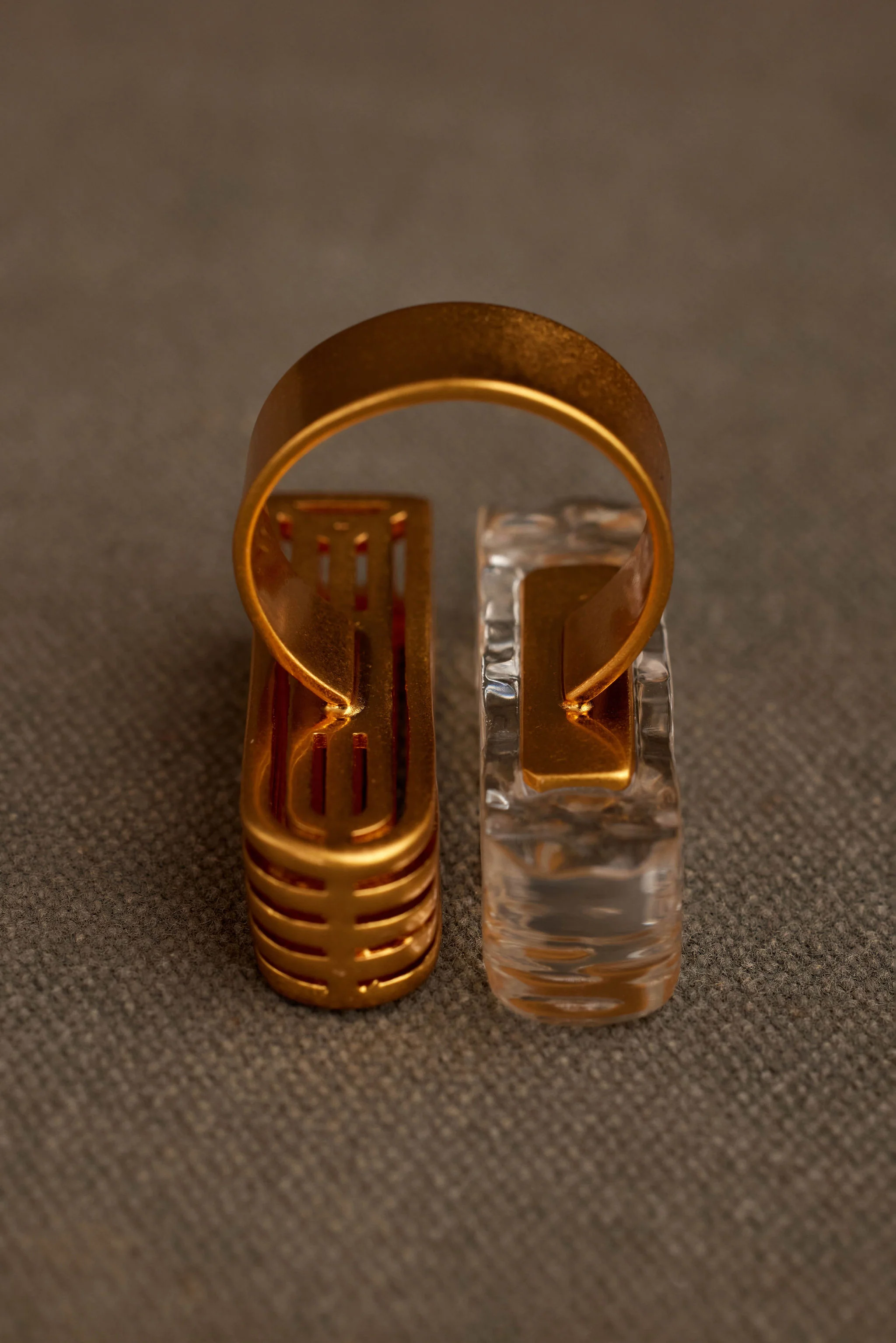 Our PILA (pi-la) ring is a seamless blend between the tranquility of frozen water and modern geometry. Featuring a half acrylic half gold dome structure, PILA stands out in the best way possible! She features a breathtaking acrylic rectangular design complimented by a gold plate that effortlessly plays with light as well as a true work of art composed of a series of intricate and unique lines that create an extraordinary shape. Her complex sculptural nature makes her a true conversation starter and head turner. She is a seamless fusion of light and substance, minimalism and richness. Her mixed materials allow her to be paired with a multitude of pieces, such as our JUHA earring or our MAJI earring. Her intriguing versatility speaks for itself and lends itself to the creative innovation of KHOI.