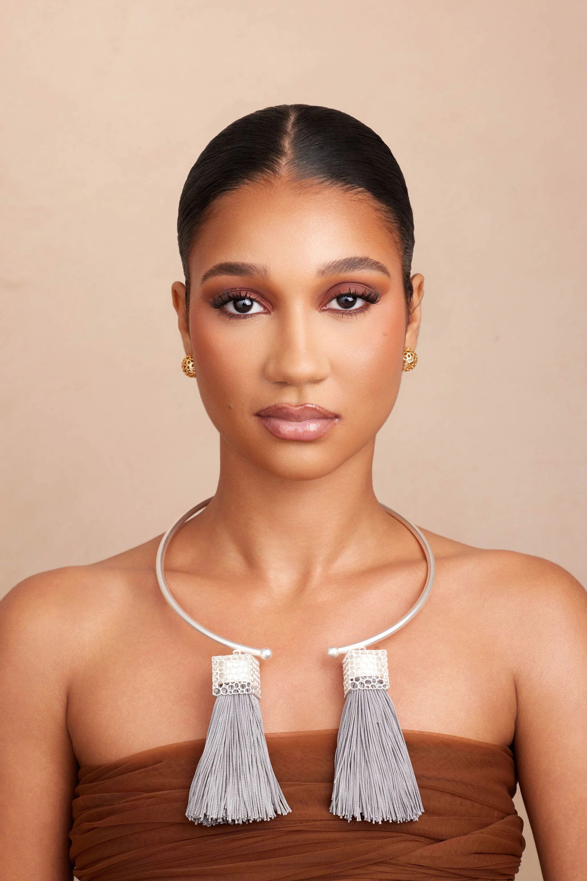 REBO seamlessly blends the classic nature of a choker with the daring tassel feature. The clean, structured silhouette enhances the contours of the neck, creating a flattering and commanding aesthetic while the TAZL accent draws attention without overpowering the overall outfit.